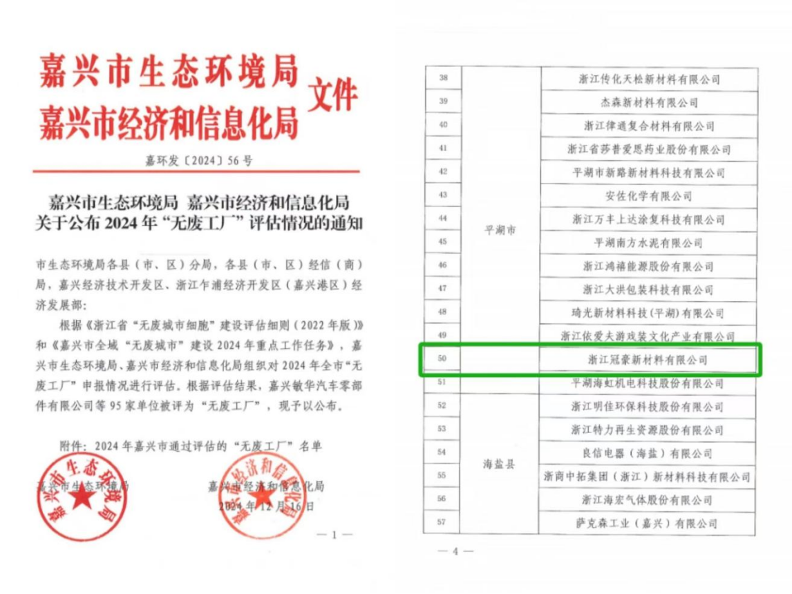 近日,嘉興市生態環境局和經信局正式公示了2024年“無廢工廠”名單,浙江冠豪順利通過評審,成功獲評“無廢工廠”稱號。